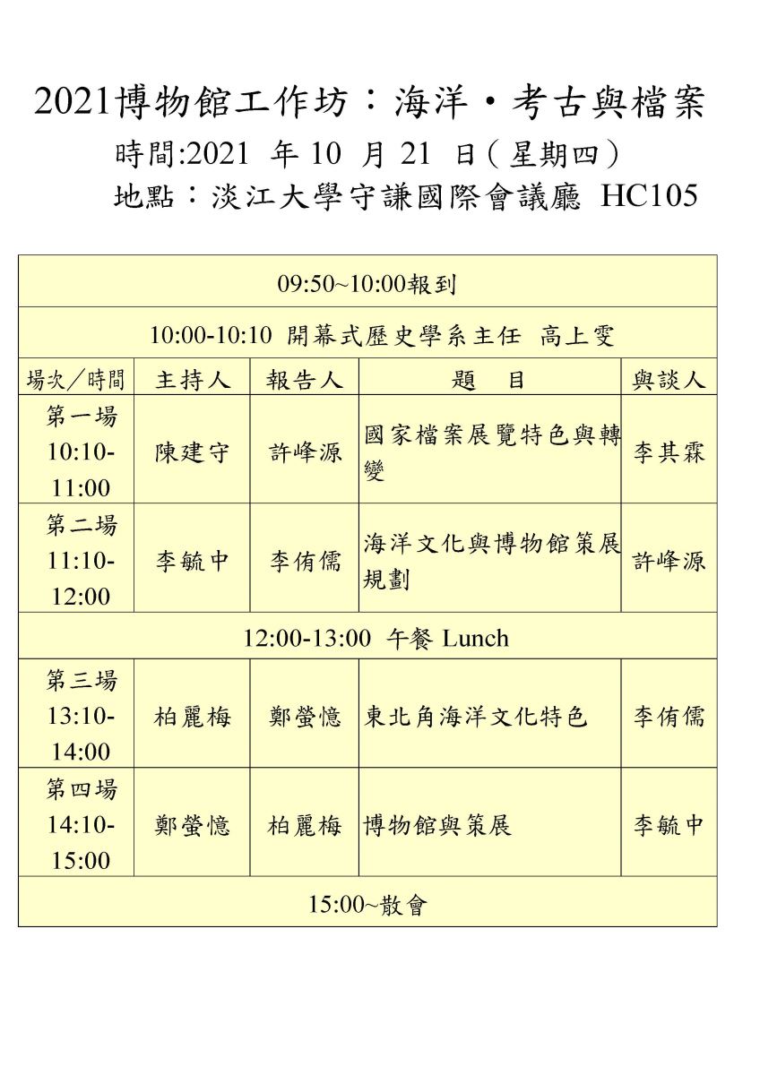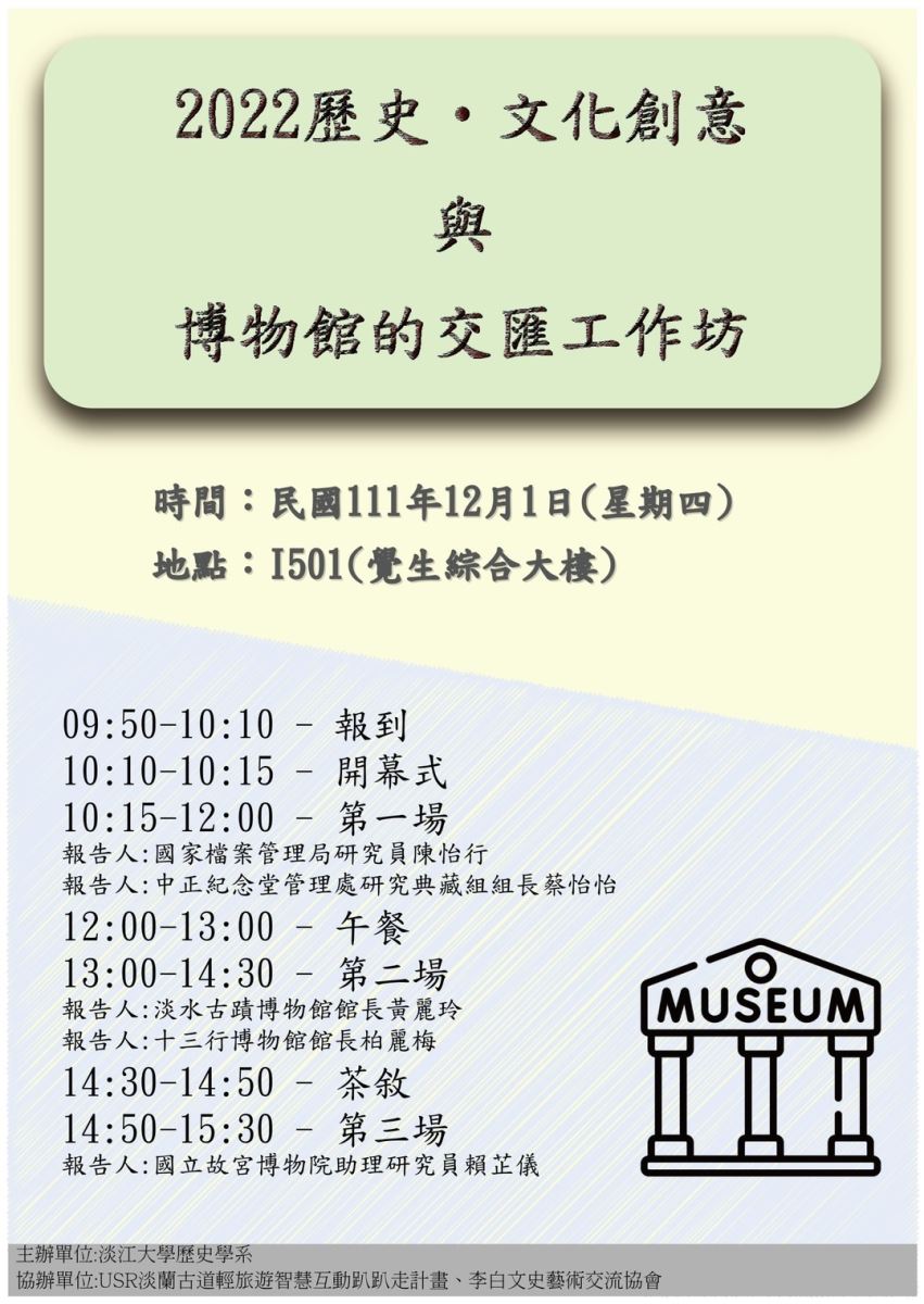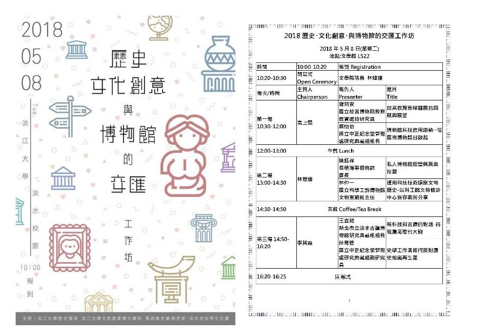 淡江大學文學院開設的文化創意學程包含歷史系所開設的相關科目,其目的是讓同學得以將自己所學,結合博物館資源,進行文化創意產業的推動,衍生出更多的就業面向。透過工作坊的舉辦與討論,將有助於師生對於博物館的相關資源與經驗的了解。並可以進一步增強文化創意產業課程之設計與產學之合作。故舉辦工作坊,俾使最新研究成果與思潮提供各界參考與運用。