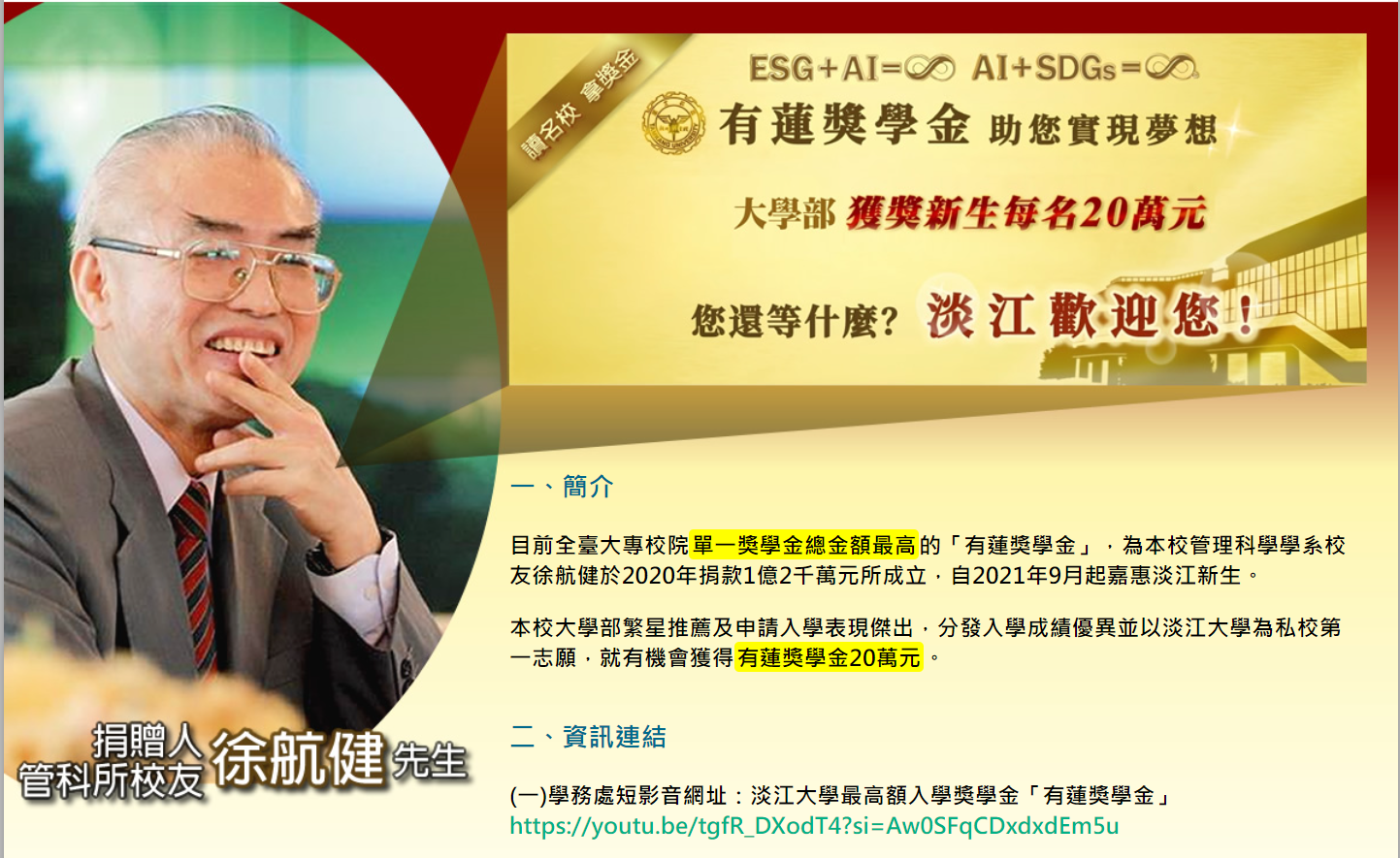 一、學務處短影音網址:淡江大學最高額入學獎學金「有蓮獎學金」:https://youtu.be/tgfR_DXodT4?si=Aw0SFqCDxdxdEm5u