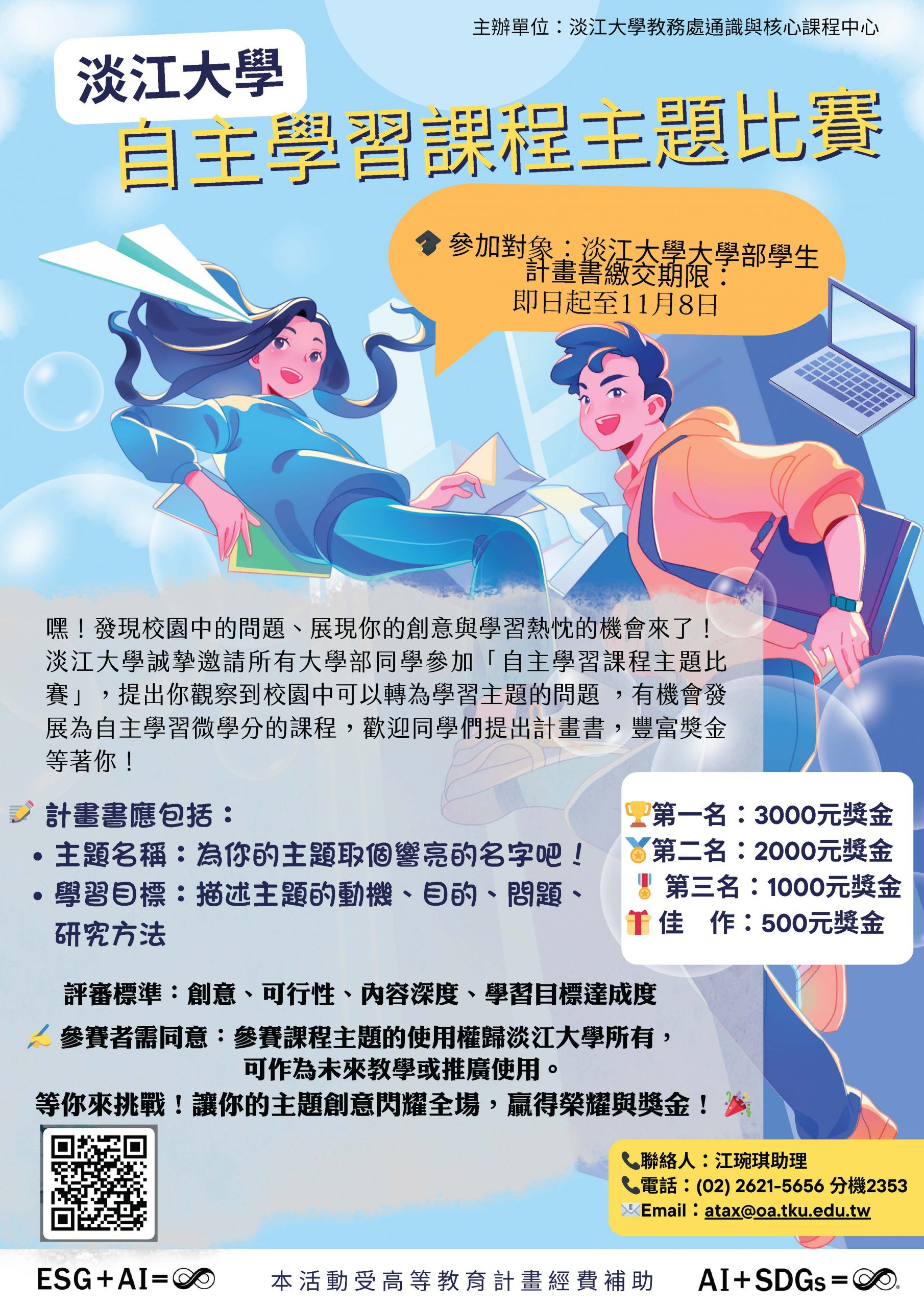 淡江大學誠摯邀請所有大學部同學參加「自主學習課程主題比賽」,提出你觀察到校園中可以轉為學習主題的問題 ,有機會發展為自主學習微學分的課程,歡迎同學們提出計畫書,豐富獎金等著你!